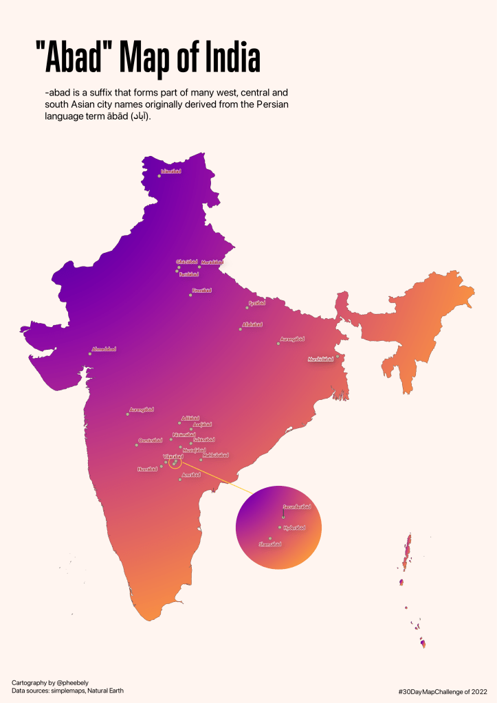 I tried to be punny. Here are cities in India that end with ‘-abad’. Initially, I wanted to map out all the cities/towns in Germany that had the word “bad” (which means “bath” in German). These cities/towns are spa towns and can legally have it in their name. Someone else had the same idea and mapped “bad” cities in Austria so, I came up with an even punnier idea – this “abad” map.