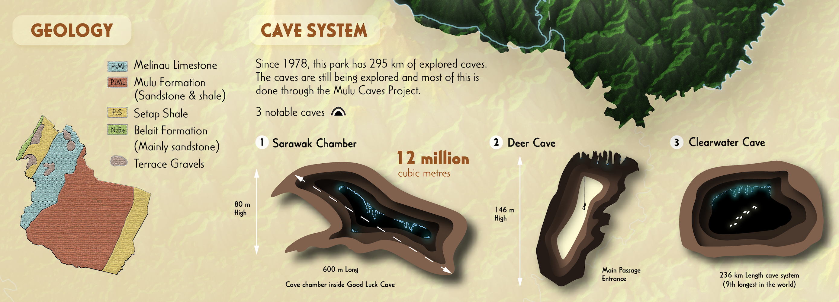 I decided to include a small map of the general geology to complement the terrain map and provide more insight into the area. For the caves, I wanted to highlight the three most notable caves, Sarawak Chamber (inside Good Luck Cave), Deer Cave, and Clearwater Cave. I made the illustrations of these caves using Adobe Illustrator based on real-life photos from Mulu Caves Project.