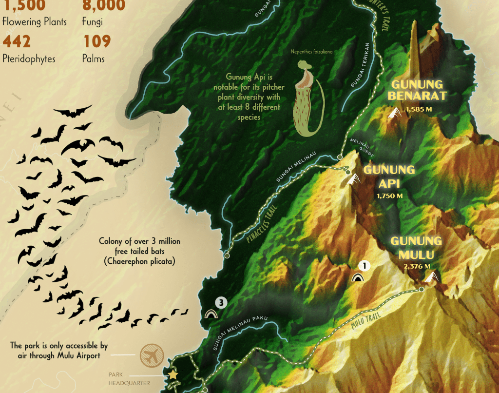 The map features a striking oblique view that captures the park’s mountainous terrain. It is so remote that the only access to the park is by flying into Mulu airport.