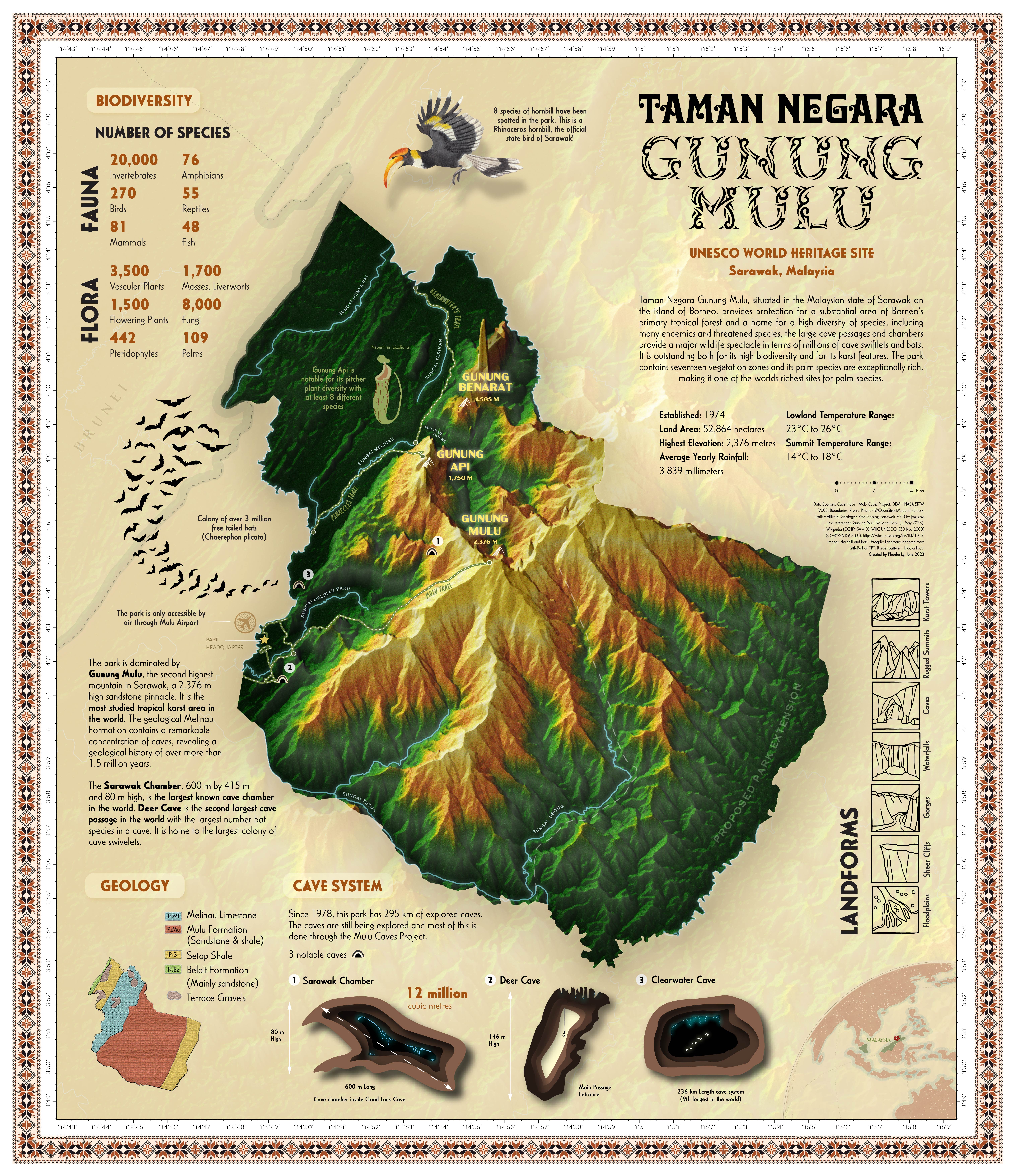 I am proud to present my first map designed for print, showcasing Taman Negara Gunung Mulu (Gunung Mulu National Park), a UNESCO World Heritage Site in Sarawak, Malaysia—my home country. This project is a tribute to its stunning beauty and biodiversity. While many beautiful maps focus on parks in North America and Europe, this map aims to educate the public about Taman Negara Gunung Mulu’s rich biodiversity and spectacular cave systems through a well-designed and easily comprehensible poster.