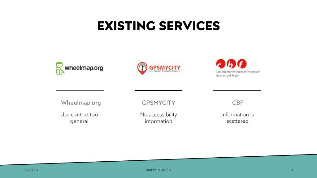 During our research on existing services, we looked into tourism and/or accessibility websites and found that there were 3 which were closely related to our idea for Mappy Munich. However, there is a big element missing from each that we aim to fix with Mappy Munich.